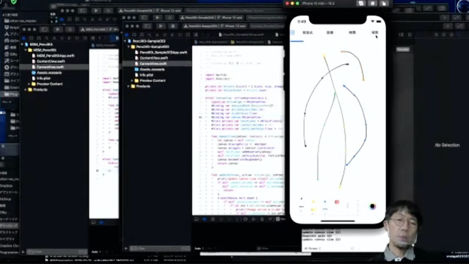 「PencilKitを遊ぼう!」では、去年登場したPencilKitを、やはり去年登場したSwiftUIで紹介された。まず、従来のUIKitアプリは元より、SwiftUIアプリにも、とても少ないコード量で手書き描画機能が導入できることが、ライブコーディングで示された。この時、PencilKitが簡単に使えるのを示すのと同時に、UIKitで作成されたカスタムUIViewをSwiftUIで用いる方法も説明された。 その後は、PencilKitの今年の機能強化点である、描画データの中身(ストロークデータ)ヘのアクセスが可能になった事に関して、関連オブジェクトと取り出せる情報の解説があり、それを踏まえた「なぞり書き」と「図形検出」のデモが、セッションの締めに披露された。デモアプリについては、ストロークデータの活用例を示すことを優先した様で、コードの説明については簡単に済ませていた。なお、配布資料ではもう少し詳しく解説しているとのことだった。