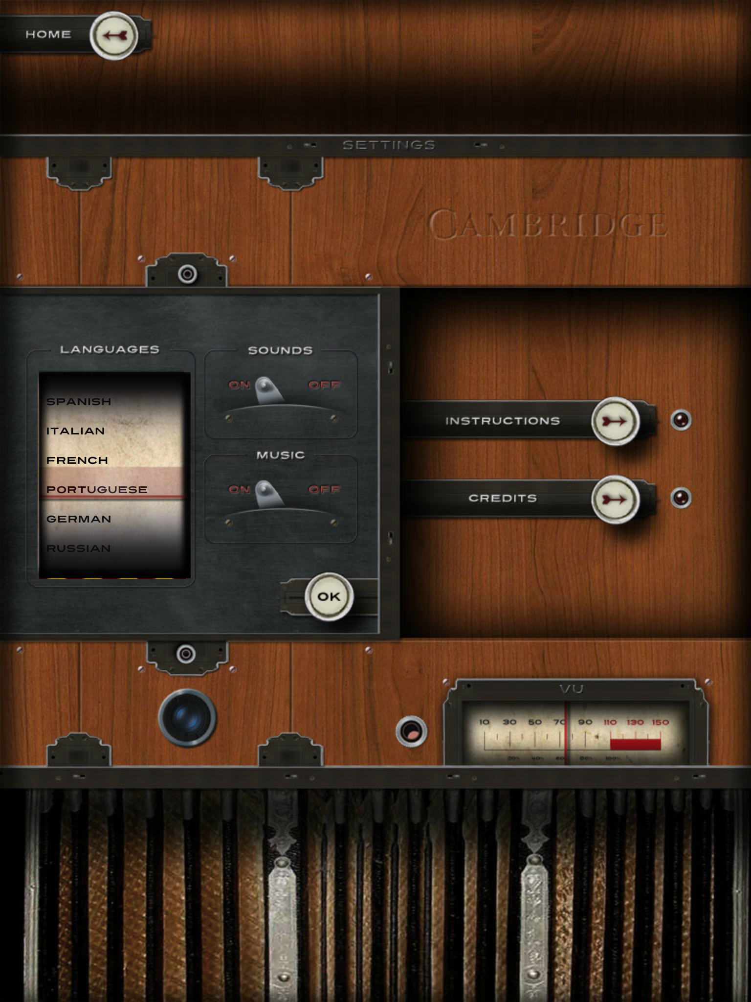 【設定画面では、英語以外に6つの言語から選択したり、効果音やBGMのオン/オフ、利用方法の解説、制作者クレジットの表示ができる】