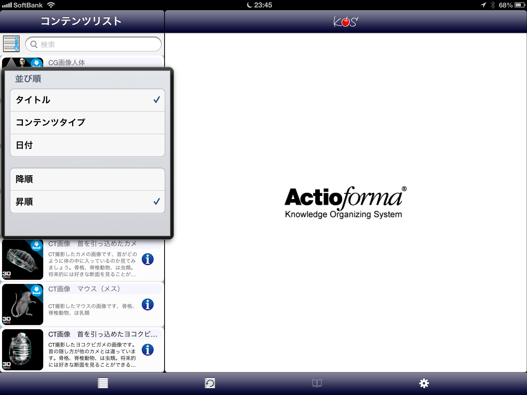 【3Dデータリストは、タイトル、コンテンツ、日付で並べ替えができ、それぞれ降順と昇順が選べる】